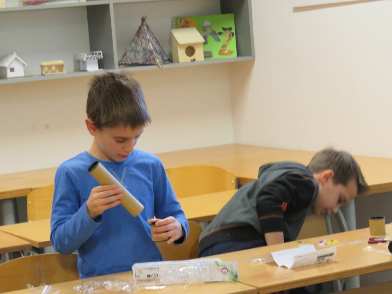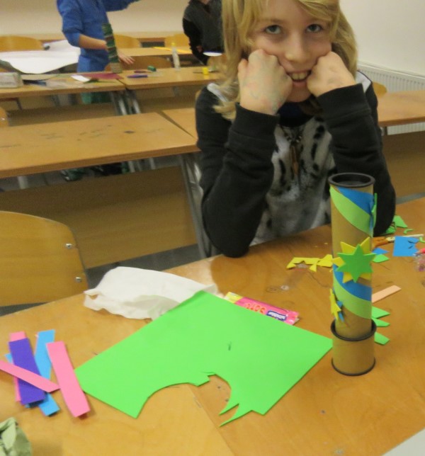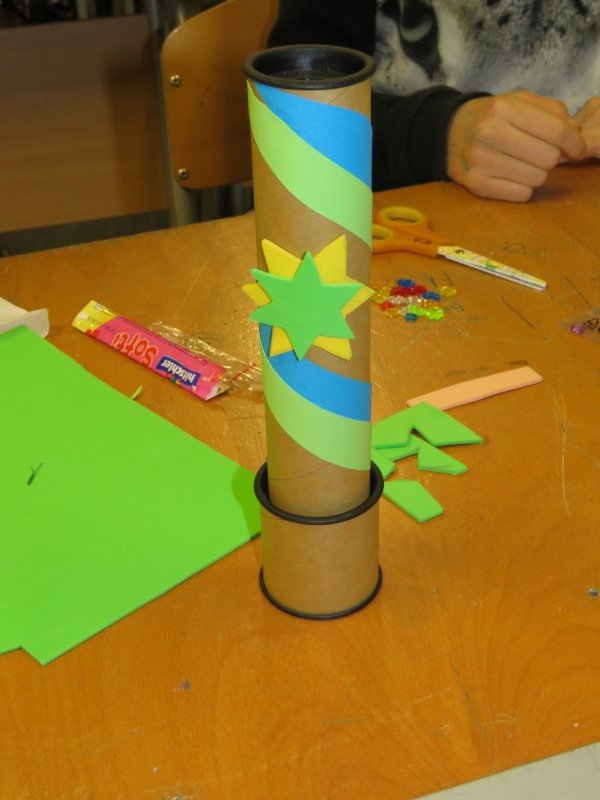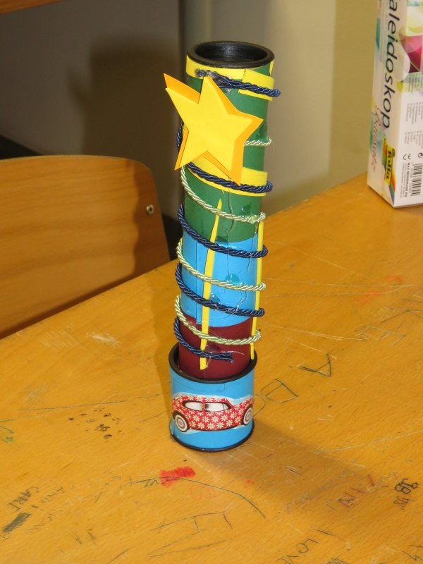 Nato so učenke in učenci izdelali vsak svoj kalejdoskop. Da bi se ločili med seboj, so zunanjost oblikovali in polepili po svojih zamislih.