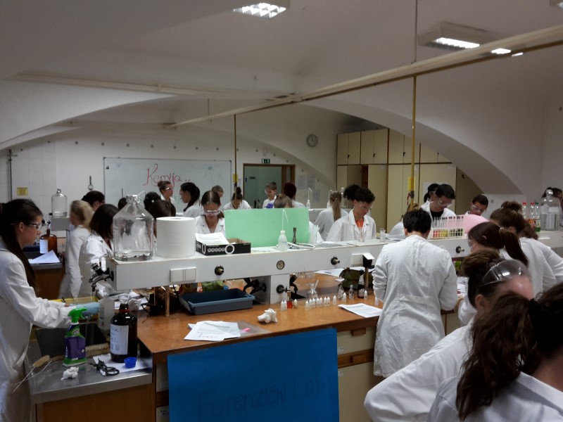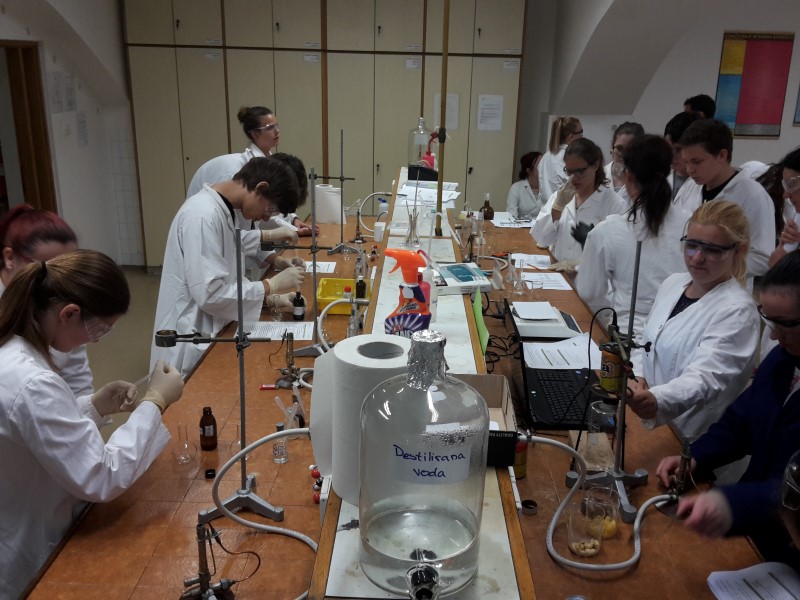 Naš nekdanji učenec g. Miha Slapničar, sedaj asistent na katedri za kemijo in kemijsko izobraževanje na Pedagoški fakulteti v Ljubljani, je povabil naše učence na dogodek z naslovom »Kemija je eksperimentiranje!«. Udeležila se ga je skupina petnajstih devetošolcev, ki so se po svoji nadarjenosti, znanju in veščinah izkazali na naravoslovnem področju ter pokazali poseben interes za kemijo in delo v kemijskem laboratoriju.
