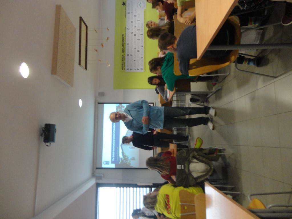 V uvodnem (skupnem) delu smo najprej prisluhnili kratkemu pozdravnemu nagovoru ravnatelja Marjana Potokarja, ki je napovedal nastop prvega gosta, gospoda Paula Waltona, ravnatelja British International School Ljubljana (Britanske mednarodne šole Ljubljana). Naš prvi govornik nam je najprej na kratko predstavil posebnosti Združenega kraljestva. Izvedeli smo, da Britanci naravnost obožujejo fish and chips (ribe in čips) in da si večkrat na dan privoščijo tea and biscuits (čaj in kekse). Povedal nam je, da so zelo ponosni na kraljevo družino in da dvonadstropne avtobuse, Big Ben ter London Bridge zagotovo uvrščamo med največje svetovne turistične atrakcije. Ob koncu predstavitve nas je pozval, naj mu zastavimo še kakšno vprašanje v zvezi s predstavljeno državo ali britanskim šolskim sistemom, nato pa se nam iskreno zahvalil za povabilo na našo šolo in nas povabil na obisk. Zatem je besedo predal šestim učencem in dijakom Britanske mednarodne šole, ki so nam v brezhibni angleščini in z veliko mero ponosa ter odločnosti predstavili svojo šolo ter z veseljem odgovarjali na vprašanja naših učencev. Ob koncu predstavitve so se še malce družili z dežurno novinarsko ekipo, ki jim je pod budnim očesom mentorice Andreje Robek Perpar spretno zastavljala vprašanja v zvezi s šolanjem, načrtovanjem prihodnosti ter preživljanjem prostega časa.