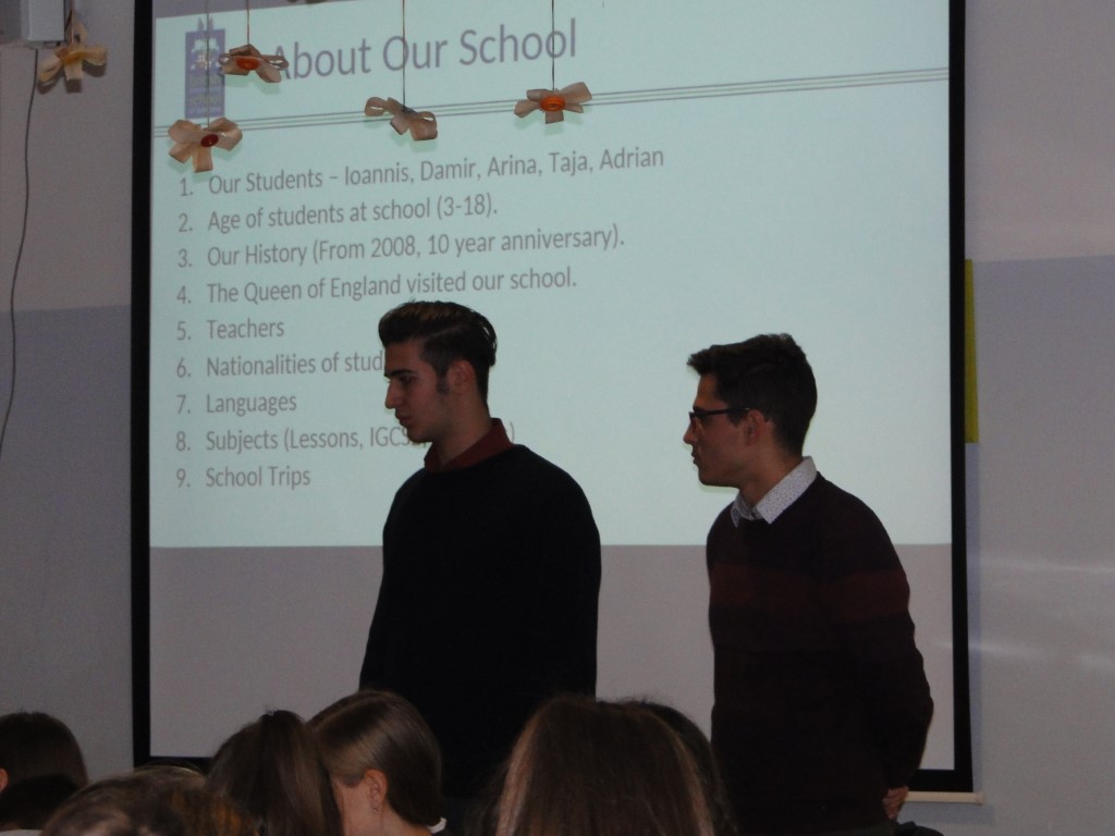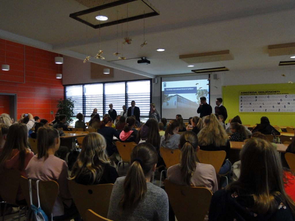 Najprej so za nas spregovorili učenci British International School Ljubljana ter njihov ravnatelj Paul Walton. Učenci so bili stari med 11 in 18 let, zato so nam z lahkoto predstavili vse stopnje šolanja (od primarnega do konca sekundarnega izobraževanja). Zanimivo je bilo opazovati njihovo navdušenje nad šolanjem, hkrati pa tudi nad svojo prihodnostjo. Učenci imajo že jasno zastavljene cilje, začrtano pot, po kateri bodo prišli do poklica oz. karierne poti. Ker za nas ni ostalo veliko časa za spraševanje, smo jih povabili, da si ogledajo še kakšno našo učilnico, mi pa smo z njimi naredili zanimiv intervju.