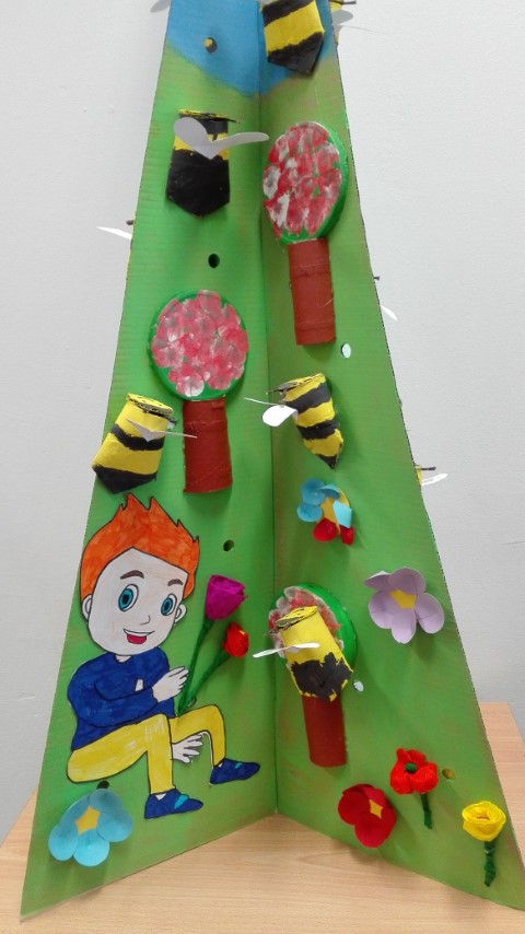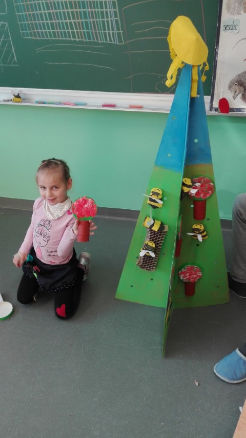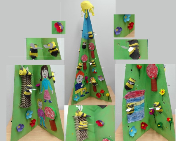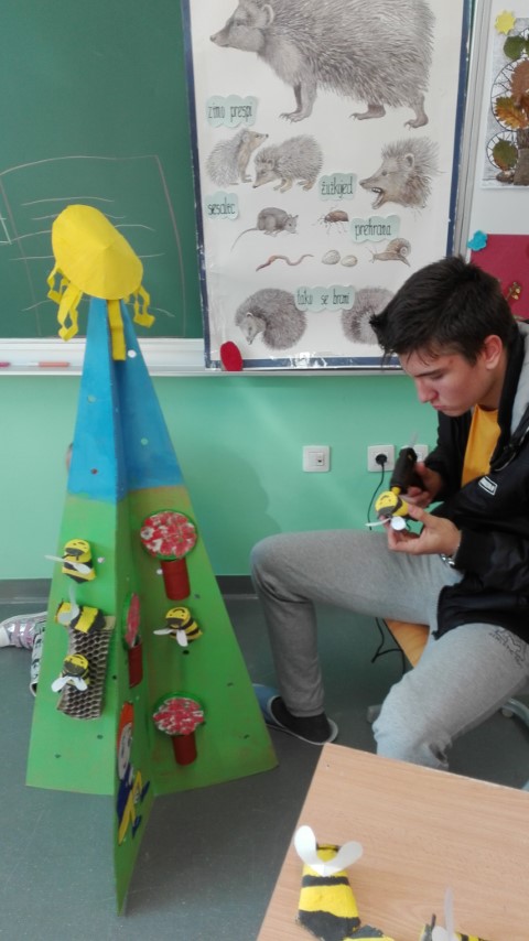 S pomočjo domišljije in ustvarjalnosti so nastali prav posebni izdelki. Učenci so iz kartona izdelali čebele, čebelnjak, satje, cvetoča drevesa, junaka Ferda, otroke, pisane cvetlice ter sonce, katere so tudi pobarvali s tempera barvami. Iz krep papirja pa so nastale prave travniške cvetlice.