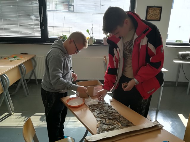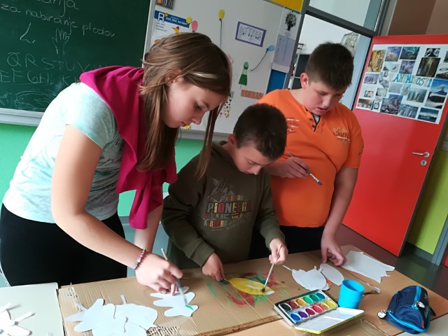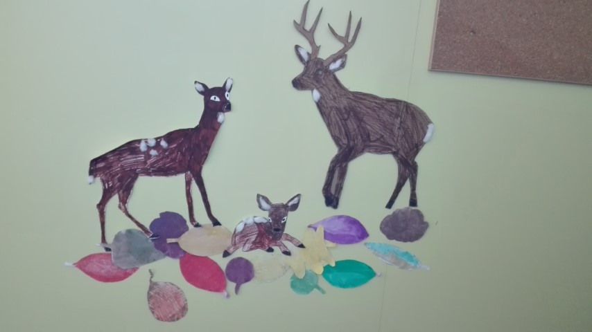Pogovarjali smo se tudi o gozdnih živalih, ki se pripravljajo na zimo. Nastale so živali iz kartona. Učenci so urili tehnike risanja, barvanja, striženja. Naredili smo ježke iz borovih storžev in DAS mase.
