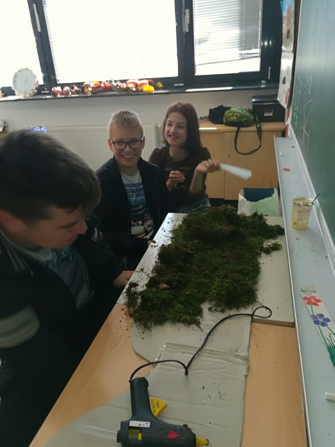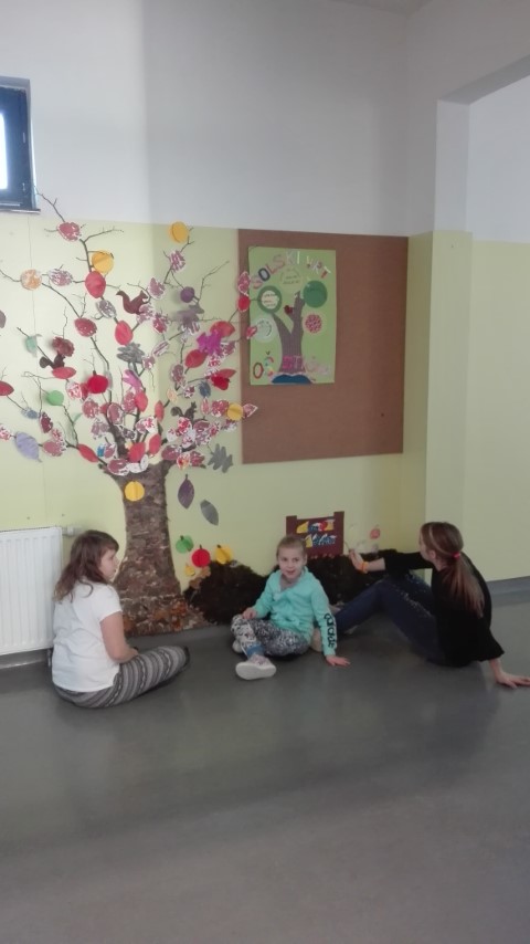 Učenci v podaljšanem bivanju že dalj časa opazujejo spreminjanje narave jeseni. Na sprehodih smo opazovali jesenski gozd, nabrali listje in jesenske plodove. Delali smo odtise listov. Naredili smo drevo iz pravega lubja, mahu in vej.