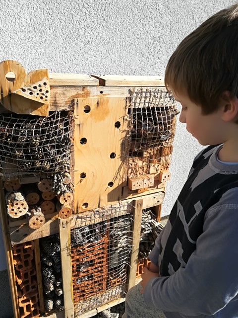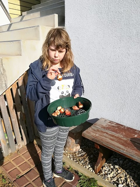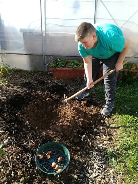 Urejali smo tudi šolski vrt. Večji fantje so odpeljali odrezane veje okrasnih grmov v gozd, mlajši pa so posadili čebulice tulipanov in uredili gredice.