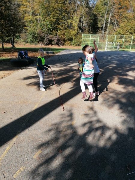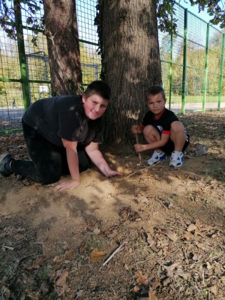 Ker na naši šoli nimamo peskovnika, ga otroci pogrešajo, zato izkoristijo pesek, ki je namenjen skoku v daljino, za oblikovanje peščenih struktur. Pri tem neznansko uživajo. Ker je okoli igrišča gozd, pa otroci ob gozdu nabirajo veje, da z njimi nekaj ustvarjajo. Skoraj vedno se nam na igrišču pridružijo tudi učenci iz OŠPP-ja. Skupaj se lepo igrajo in zabavajo.