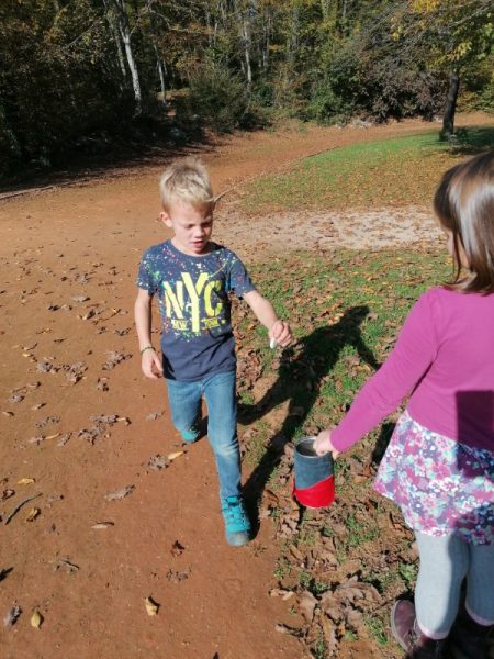 V mesecu oktobru smo izkoristili veliko lepih sončnih dni za aktivnosti na zunanjem igrišču. Vsakič ko pridemo na igrišče, se otroci ogrejejo s tekom po atletski progi. Vsak ima v roki “kamenčke” za motivacijo; en “kamenček” pomeni en krog teka. Po odtečenih krogih pa si otroci najdejo različne dejavnosti za kratkočasenje.