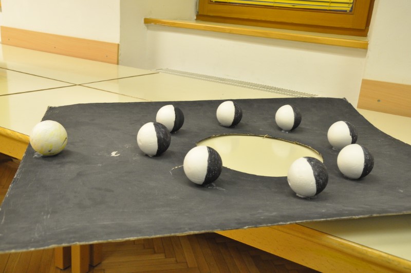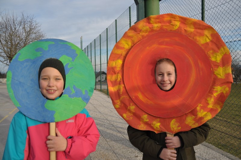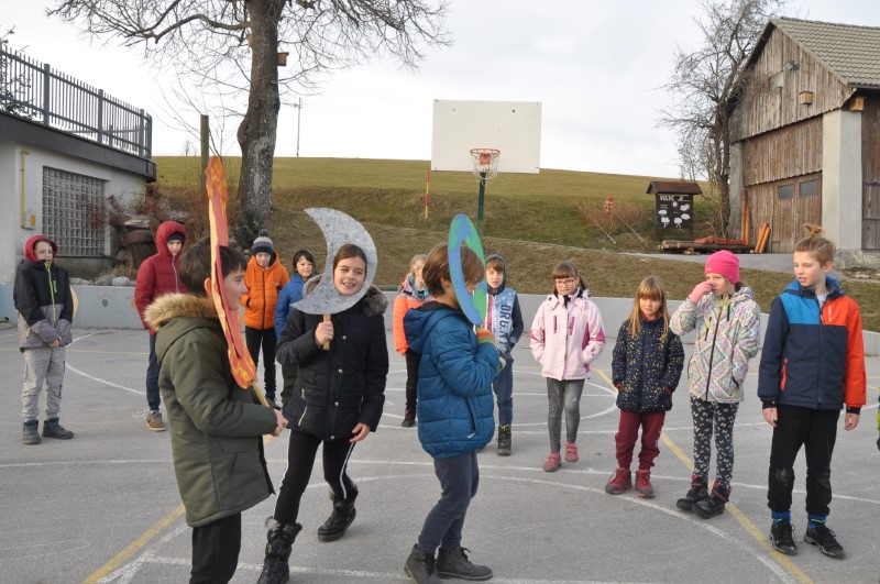 Popoldne po kosilu smo odšli na dvorišče, kjer smo si skozi teleskop pogledali Sonce, spoznali smo Lunine mene in si naredili svoj model, ki prikazuje, v kakšnem odnosu so Zemlja, Luna in Sonce med seboj v vesolju. Merili smo svojo senco in ugotovili, kako se ta spreminja s časom.