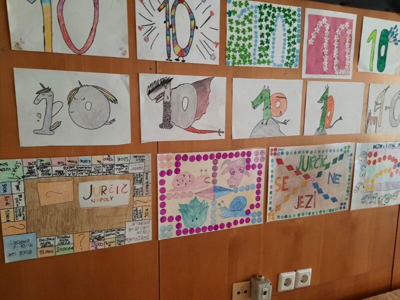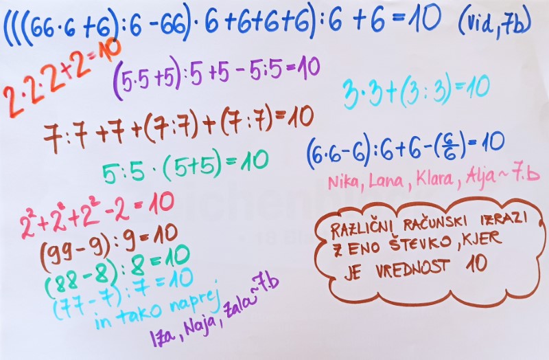Spet drugi so pisali pesmice, zgodbe ali izštevanke na temo števila 10. Spretni matematični umi pa so iskali računske izraze z eno števko in rezultatom 10. Na ogled postavljamo nekaj najbolj izvirnih izdelkov.