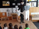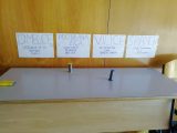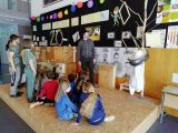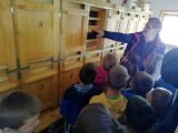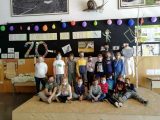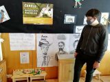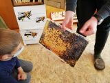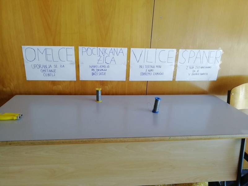Po vrnitvi smo si v avli šole ogledali zanimivo razstavo o čebelah, panjih, čebelarskih pripomočkih ter začetnikih čebelarstva na Slovenskem, ki nam jo je podrobneje predstavil devetošolec Timotej Martini, večletni član šolskega čebelarskega krožka.