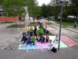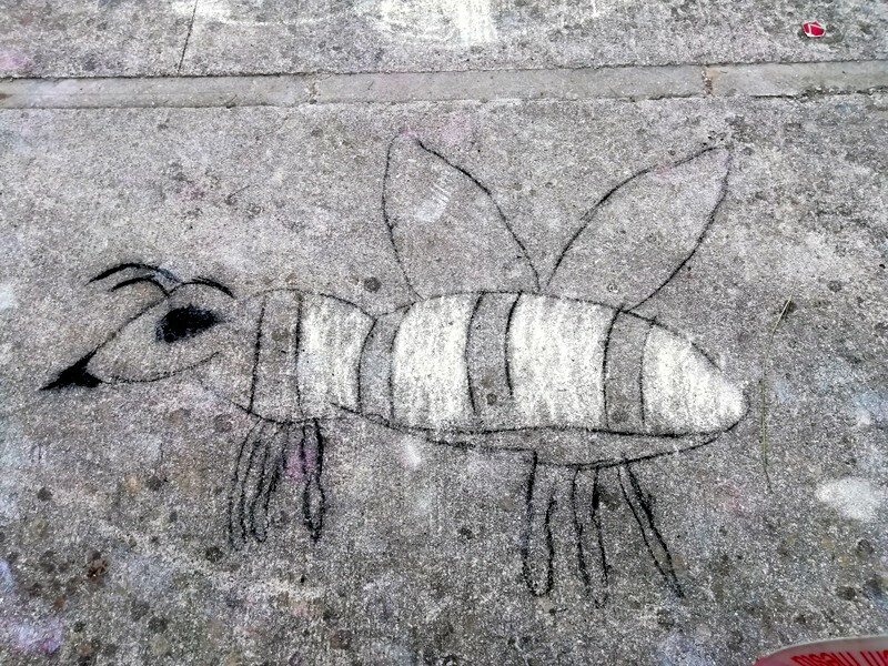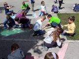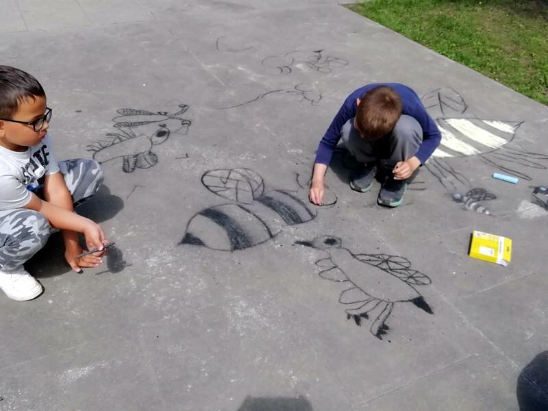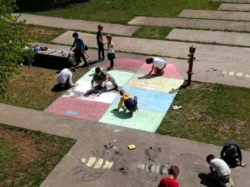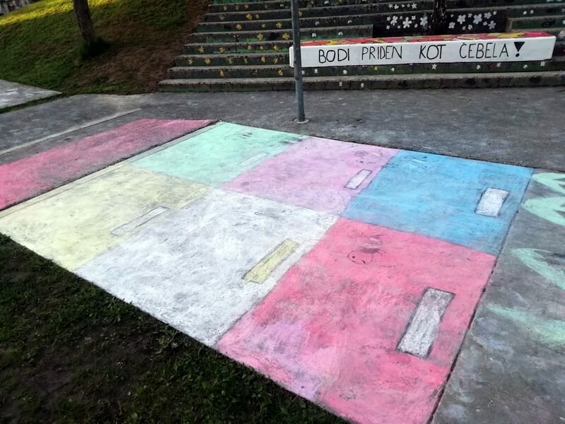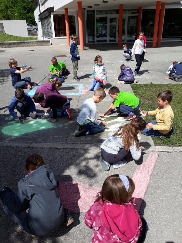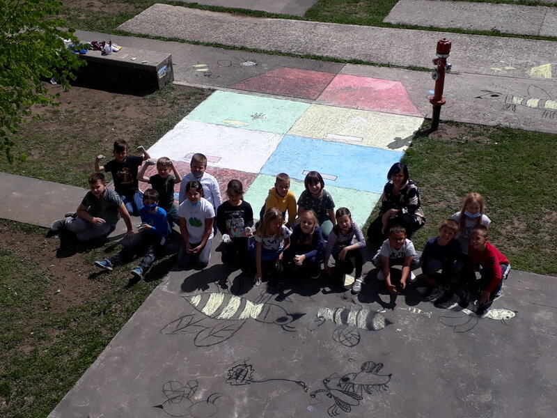 Dan smo zaključili z ustvarjanjem. Z barvnimi kredami smo na temo čebelarstva na asfaltnih površinah pred šolo ustvarili čebelarsko pravljico in na ta način širili zavest o pomenu čebel za obstoj življenja na Zemlji.