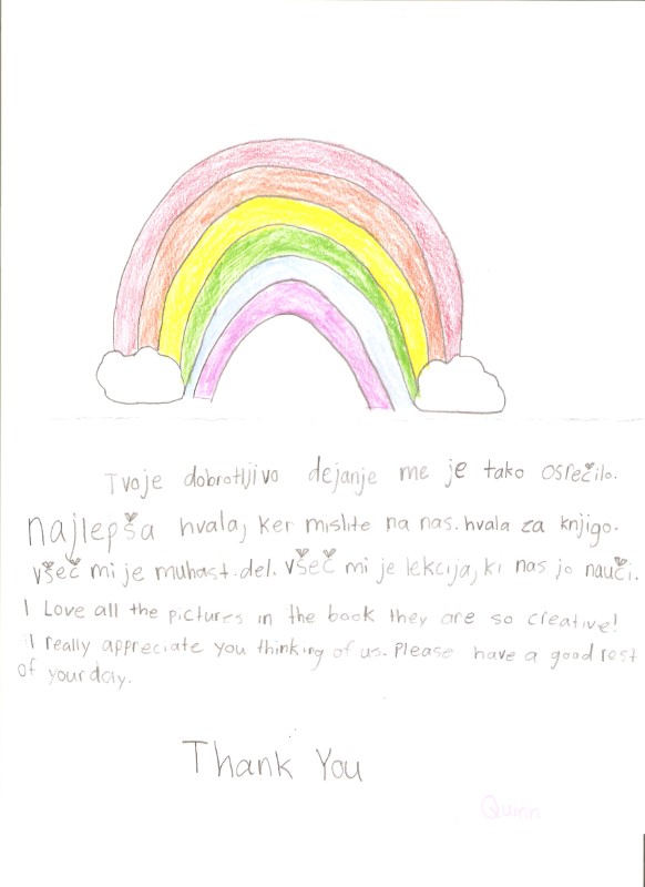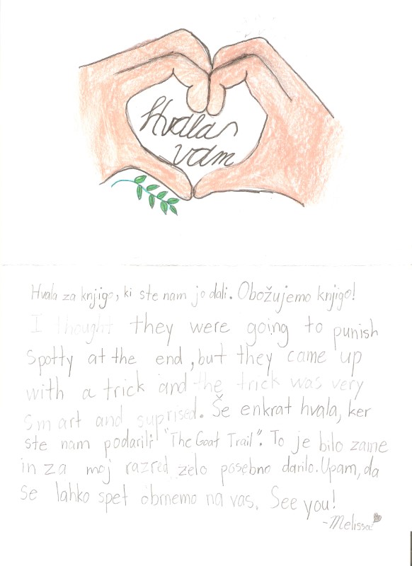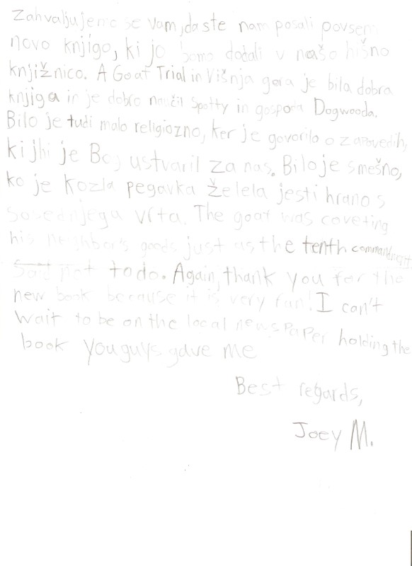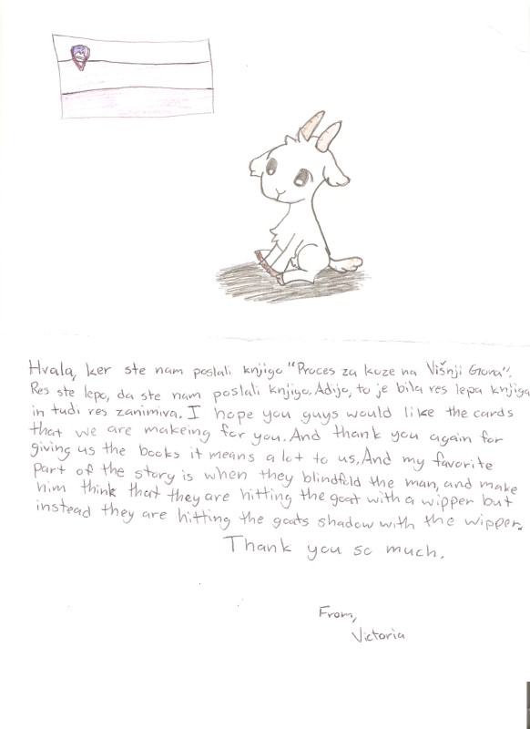 Ta projekt ne bi bil mogoč brez pomoči Zavoda prijetno domače na čelu z direktorico Majo Lampret, ki je velikodušno podarila 25 knjig A goat trial in Višnja Gora za učence šole St. Junipero Serra Catholic School, ter omogočila snemanje filma na Jurčičevi domačiji na Muljavi.