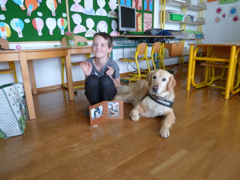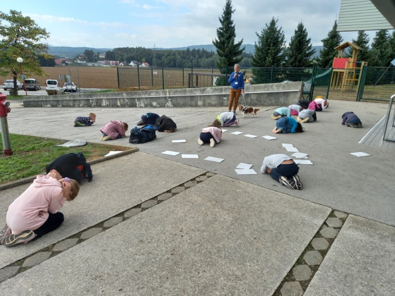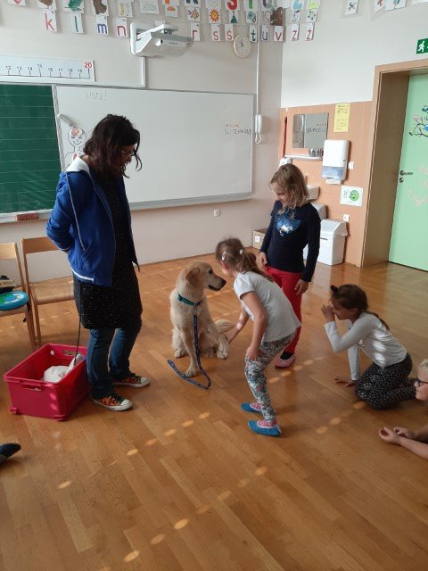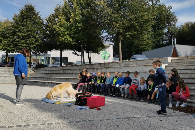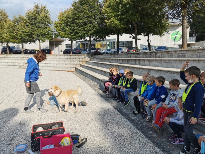V razredu sta nas obiskala Jana in pes Oli. Bili smo že zelo nestrpni. Sedeli smo v polkrogu in pozorno poslušali Jano, ki nam je povedala veliko zanimivega. Pes Oli nas je milo in prijazno gledal ter komaj čakal, da bi se crkljal. Celo dve učenki, ki se zelo bojita psov, je Oli prepričal s svojim pogledom, da sta se ga upali dotakniti in pobožati.