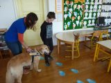 Učiteljici dodatne strokovne pomoči sva ob pomoči razredničark izbrali različne učence iz 1., 2. in 3. razreda, ki bodo od februarja do maja deležni individualnega obiska Olija in njegove vodnice Jane. Z gospo Jano skupaj načrtujemo vsebino srečanj. Učiteljici DSP poskrbiva za ustrezne učne materiale, ki so prilagojeni učencem, in sva aktivno udeleženi pri izvedbi ur. Na vsakem srečanju se učenje prepleta z dejavnostmi, ki jih otrok izvaja s kužkom, in tako še na drugačen način razvija svoja področja. Slike povedo več kot tisoč besed.